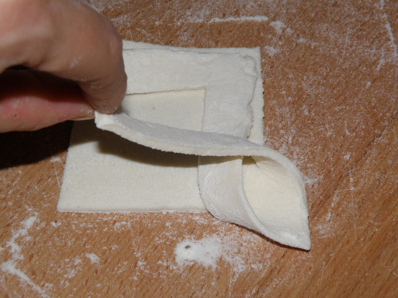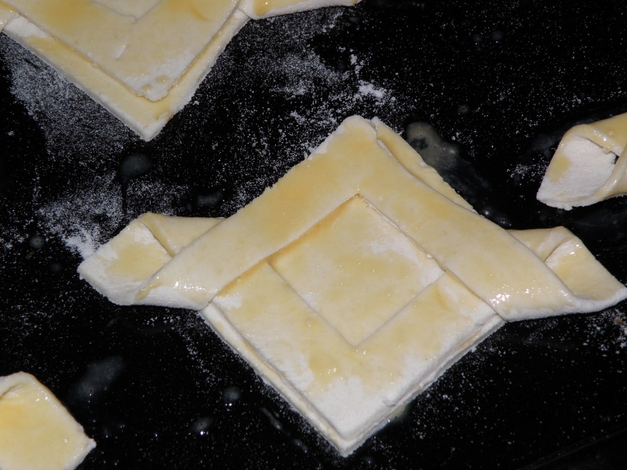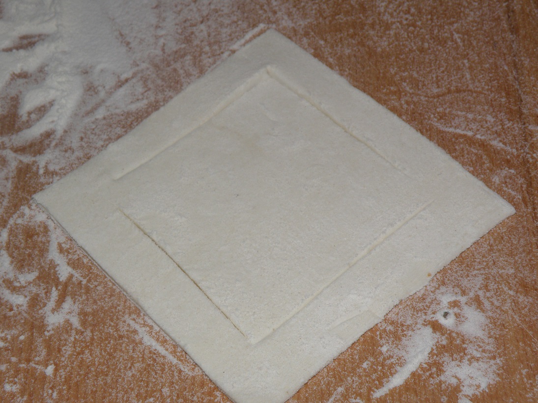 - A leveles tésztát kinyújtom kb. 2-3mm vastagra és 10 x 10 cm négyzetekre vágom. Fontos, hogy pontosan legyenek kimérve a négyzetek ( vonalzóval), mert különben nem fog sikerülni a hajtogatás. Minden négyzetben, kb. 1 cm távol a szélétől, még egy kisebb négyzetet vágok, úgy hogy a kettő szemben lévő sarkot nem vágom be teljesen (lásd az 1 képet). Lehajtom a tetejét, majd ráhajtom az alját.