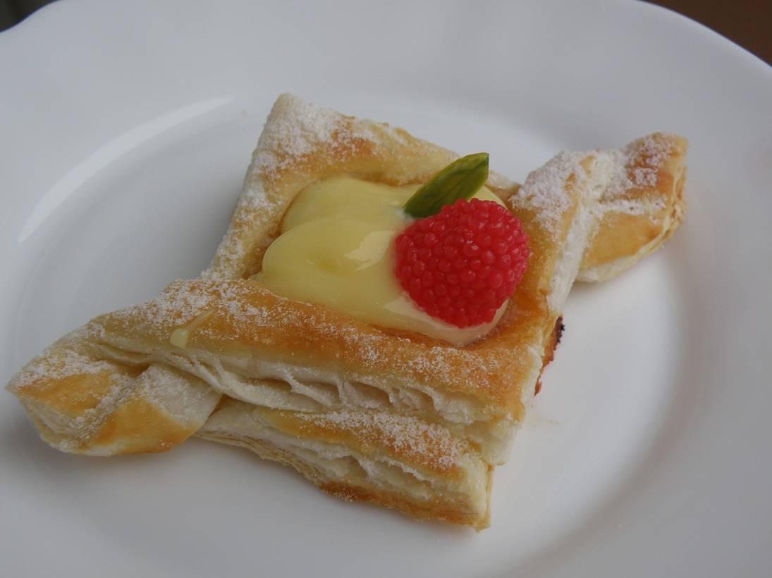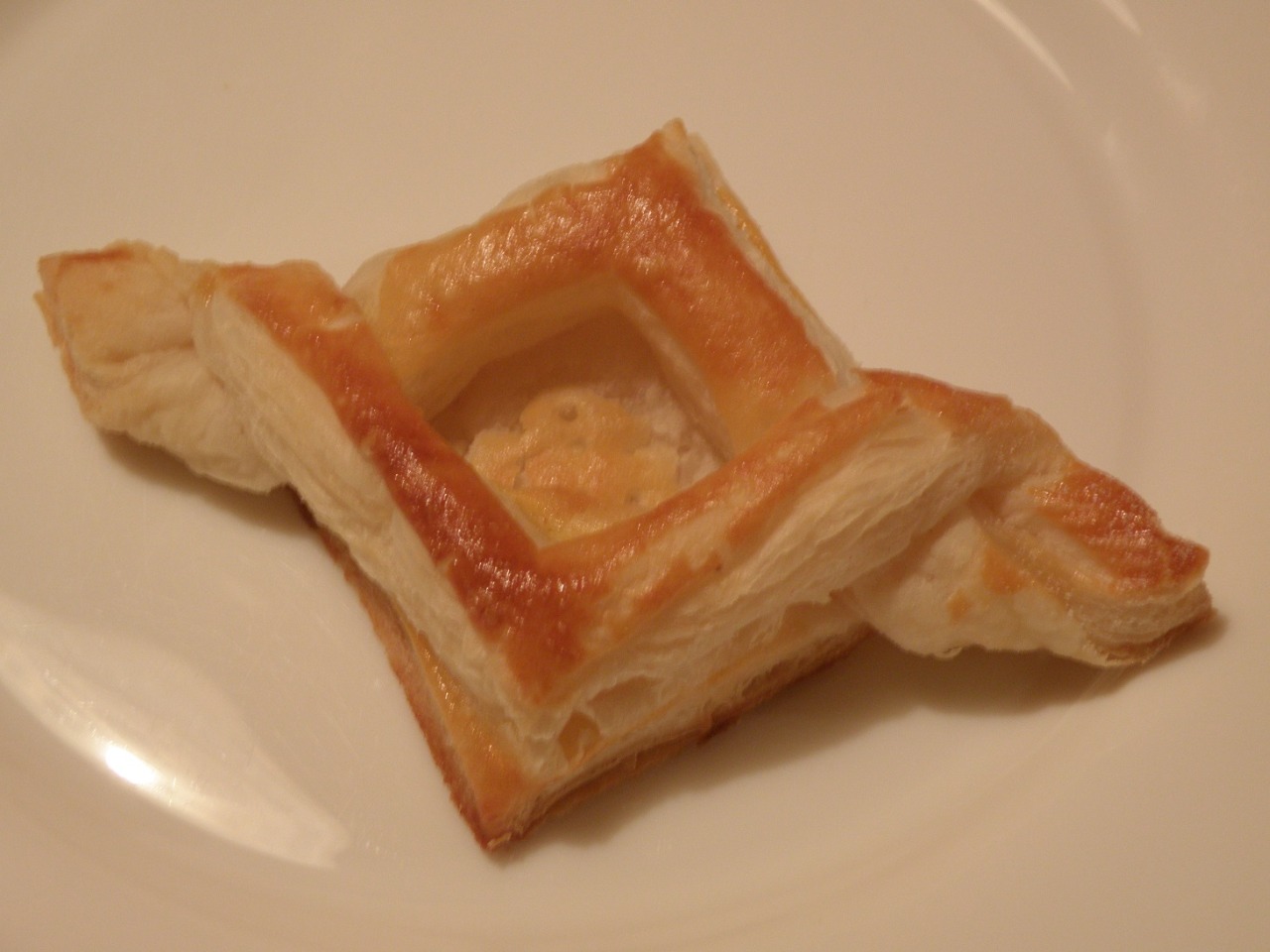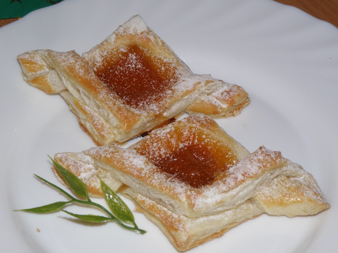 - A leveles tésztát kinyújtom kb. 2-3mm vastagra és 10 x 10 cm négyzetekre vágom. Fontos, hogy pontosan legyenek kimérve a négyzetek ( vonalzóval), mert különben nem fog sikerülni a hajtogatás. Minden négyzetben, kb. 1 cm távol a szélétől, még egy kisebb négyzetet vágok, úgy hogy a kettő szemben lévő sarkot nem vágom be teljesen (lásd az 1 képet). Lehajtom a tetejét, majd ráhajtom az alját.